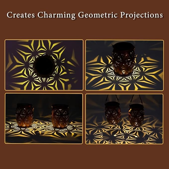 - UNIQUE VISUAL EFFECT: The outdoor solar lanterns feature intricate geometric patterns that are finely carved and hollowed out to create fascinating dancing flame projections on the ground or tabletop, casting a warm glow in the darkness, like blooming flowers, creating a soft and warm ambiance in your garden/patio