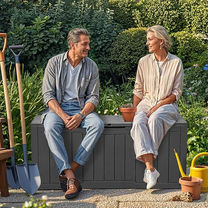 - Extra Seating: Doubling as a comfortable bench seat, this plastic deck box can support up to 485 pounds; Set it up in just 15-30 minutes, and enjoy its unique wood-grain texture that seamlessly blends with any patio or deck decor in no time