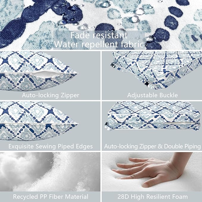 LVTXIII Outdoor Deep Seat Cushion Patio Seat and Back Cushion Set Seasonal Chair Cushion with Removable Cover and Adjustable Buckle for Home and Garden, 24"x24"x4", Boho Geometry Blue