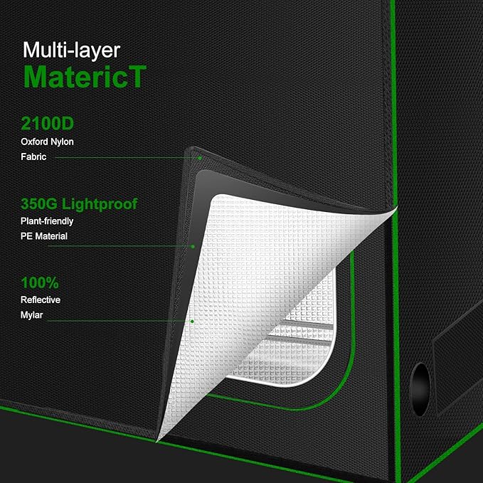 - 【Highly Reflective Material】: The grow tent is lined with 100% highly reflective 2100D diamond polyester film, which has excellent reflective performance, effectively assists your indoor growing lamps and equipment, enhances light utilization, maximizes plant photosynthesis, and provides sufficient growth energy for your plants.