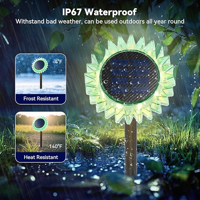 - Rotatable Solar Panel & Long-Lasting Battery: Solar sunflowers lights equipped 180° adjustment upgraded larger solar panel with higher conversion rates and optimal absorption of sunlight, with 1000mAh rechargeable battery for charging in 4-6 hours and providing 8-10 hours of illumination.Decorate with solar garden stake light, you can enjoy your beautiful garden/courtyards all night long