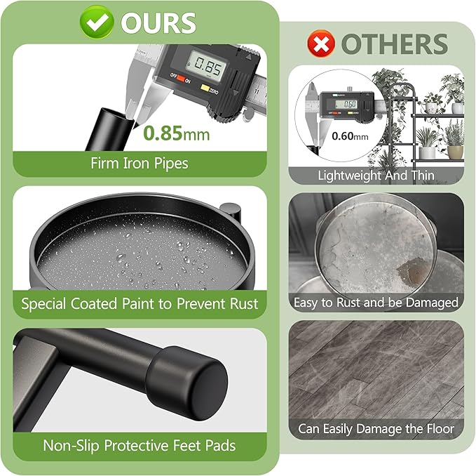 - 【Strong & Sturdy】Our 7 tier metal plant stand is constructed with heavy-duty iron and adopt high temperature electrostatic spray paint every weld is guaranteed to be long-lasting and resistant to corrosion; Perfect for using this black plant stand for outdoor, garden, and patio. The bottom of the plant stand is equipped with protective pads to prevent floor scratches and abrasions. It has a maximum weight capacity of 156 lbs.