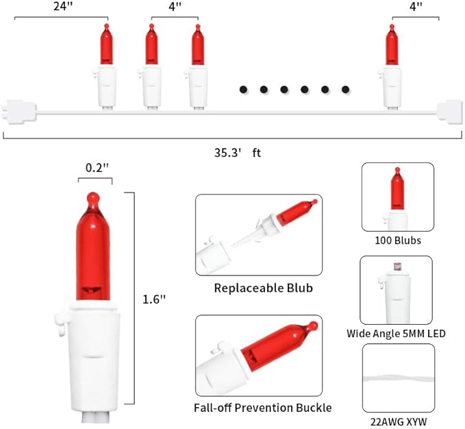 - 【Mini Christmas Lights Specification】: 2 Sets - white wire chritsmas light string includes 100 count red LED lights, total length 35.3ft, lights length 33ft and each led is 4 inches apart, 24 inches lead wire, 4 inches end connector (Extra 2 x bulbs and 1 x fuse included)