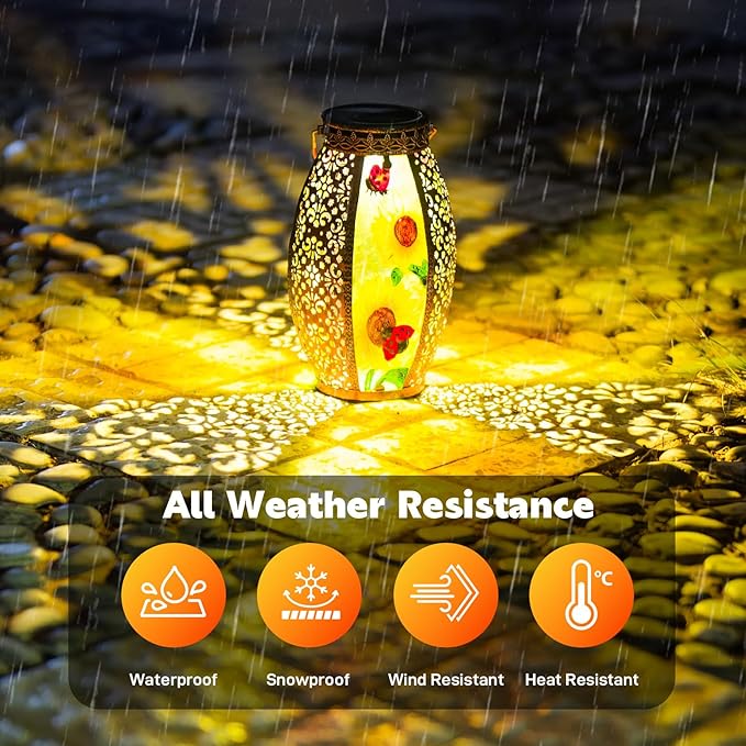 - 【Waterproof & Durable】Sunflower solar lantern has a total height of 13.8” and a width of 6.7”. The entire lantern is made of high-quality materials, and the IP65 waterproof rating ensures that outdoor solar lanterns is not easily rusted or faded, making it suitable for outdoor or indoor use.
