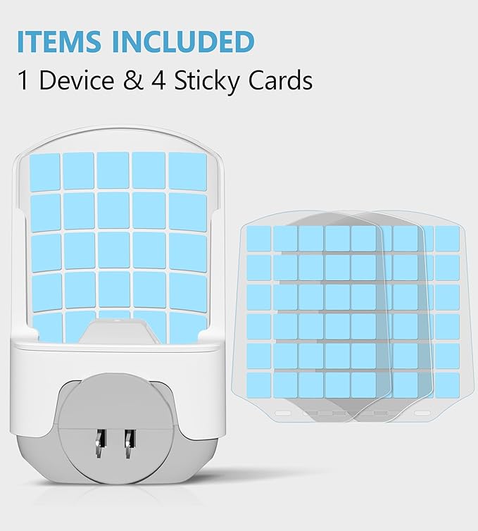 - Upgraded Materials: Crafted from durable, fire-retardant ABS material, this flying insect trap ensures long-lasting safe use. The plug-in housing is lightproof, directing light onto the device and surrounding walls to better attract insects. The sticky card features blue grid patterns to enhance attraction and maximize effectiveness, making it a perfect indoor fruit fly trap for pest control