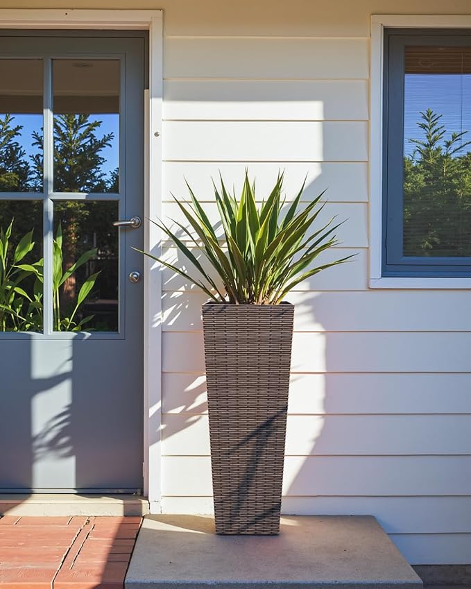 Greesum 32 Inch Tall Plastic Planters with Rattan Texture – Set of 2, Detachable Inner Pot & Drainage Holes, Indoor/Outdoor Decorative Flower Pots for Large Plants, Trees, Patio, and Garden, Brown