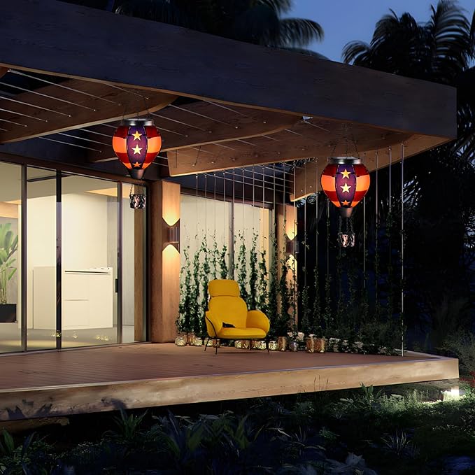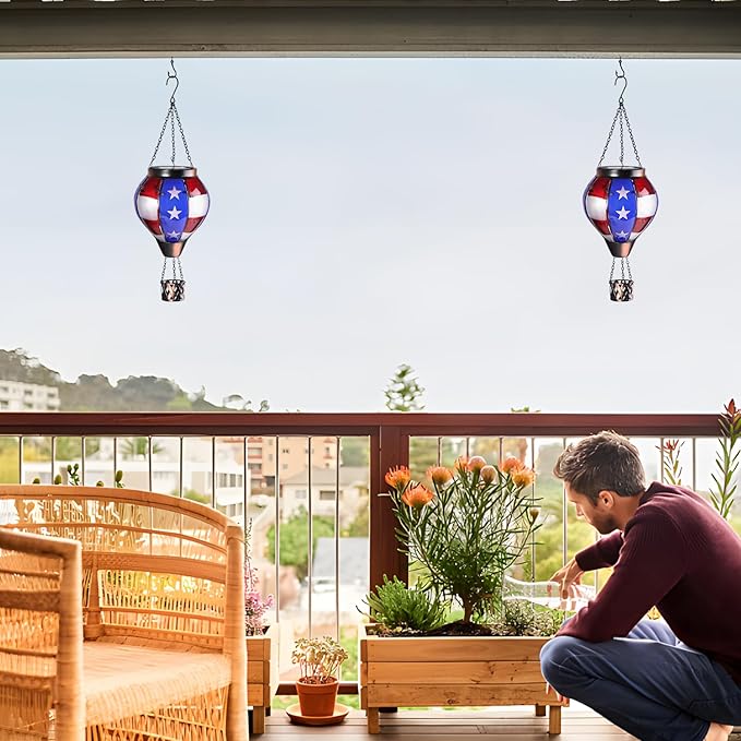 - 【Unique Hot Air Balloon Design】--This hanging solar light is composed of 8 pieces of flag style glass with lifelike flame lights. As night falls, their glow adds warmth and comfort to your garden, patio, yard, path, and more. July 4th Independence Day decoration, great Christmas decorative lights.