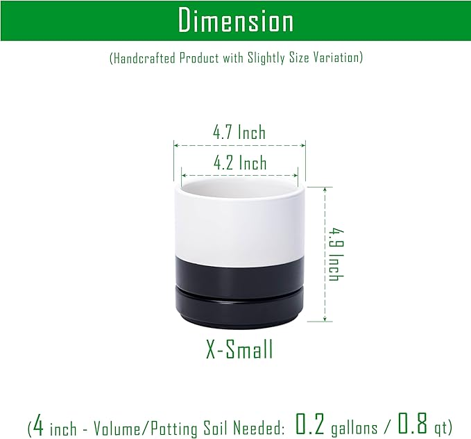 - Multiple Size Options: Available in six sizes (3.5" to 11.8") to fit plants of all types, from small succulents to larger houseplants. X-Small 4.6 Inch Planter Pot: 4.7" Diameter x 4.9" H, Potting Soil Needed: 0.2 gallons / 0.8 qt.