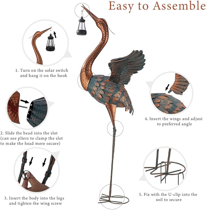 - Easy to Assemble: No tools necessary, just insert the head and legs of the crane yard statues on the body, comes with the deep and sturdy U-shaped ground stakes to secure in the ground enhance stability