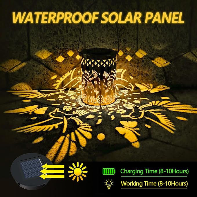 - Durable Solar Lantern: The hanging solar lantern is equipped with upgraded high-efficiency solar panel and battery, LED light source is more stable. Collects sunlight during the day to charge the battery for 6 hours, and continue to work for at least 8 hours at night.