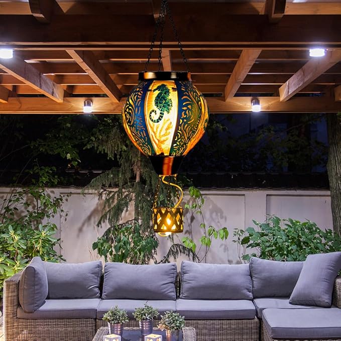 - Outdoor Solar Lanterns Perfect Size: The product package contains 1 seahorse hot air balloon solar lanterns;hanging Solar light 5.5 "wide *18" high,easy hanging and durable,Perfect for various outdoor spaces like garden decor,porch decor,pathway decor,yard decor,or party decor