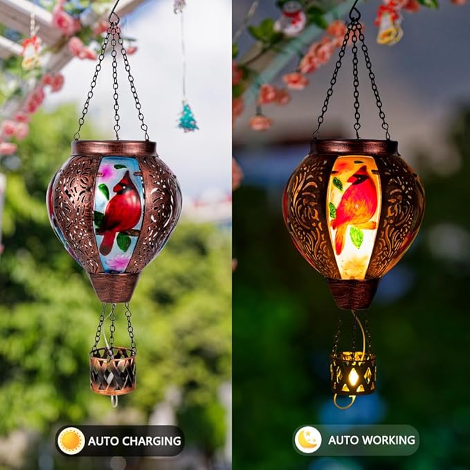 - Cardinal Solar Hot Air Balloon lantern: Solar outdoor Lantern is made of thick glass,metal and a realistic flame lights.solar hot air balloon flickering flame is a brightly colored ornament during the day,When the sun goes down,The flickering flame effect is like a real hot air balloon,making it an excellent garden decoration