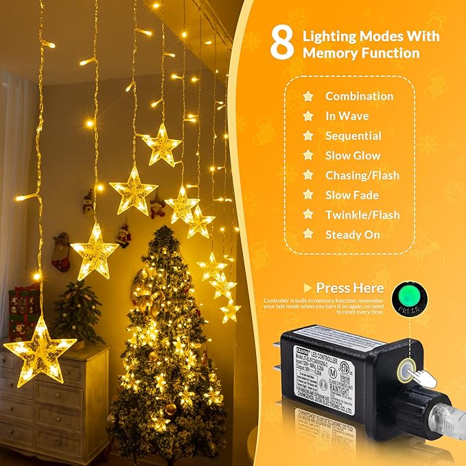 - 🌟8 Modes and Timers: The Star Christmas Window Lights are available in 8 lighting modes to choose from, with 8 mode Settings including Combination, Wave, Sequence, SLO-GLO, Chase/flash, Slow Fade, flash/flash and Stable to suit your different needs. At the push of a button, the programmed energy-saving timer mode will allow these LED bulbs to remain on a 24-hour cycle for six hours and automatically turn off for the next 18 hours. Our Christmas window ice strip lights also have a memory function that will keep this cyclic mode, saving you the trouble of setting it manually. Even if the LED lights go out, your choice will be remembered