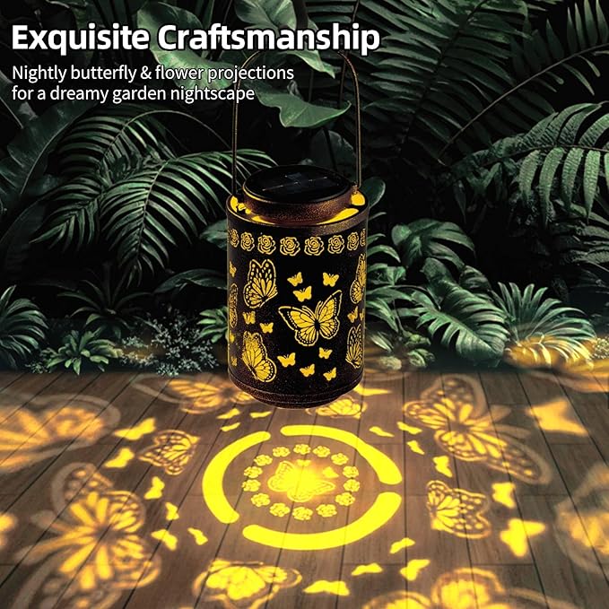 - Enchanting Outdoor Glow: Featuring an graceful butterfly hollowed design with a vintage copper finish, this solar lantern adds a touch of charm and sophistication to any outdoor space. When illuminated, it casts mesmerizing butterfly projections, creating a cozy and magical atmosphere for your garden, backyard, or patio