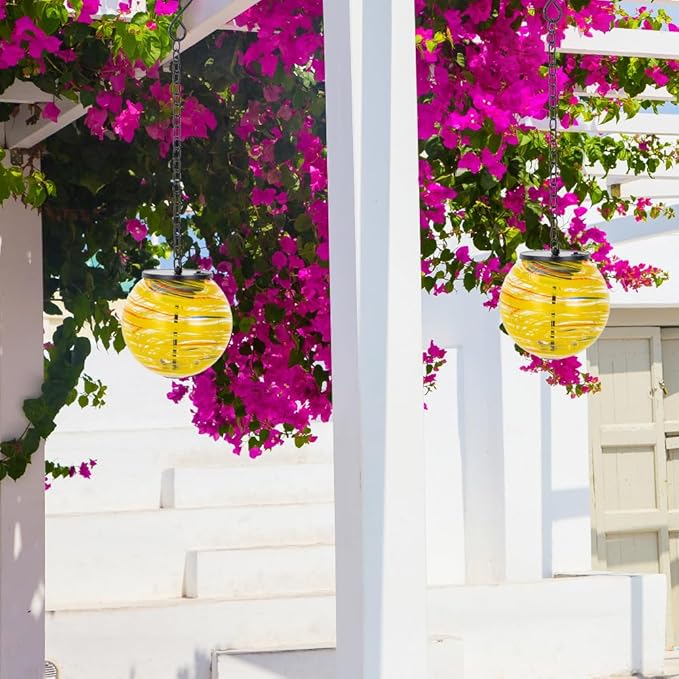 Solar Lanterns Outdoor Waterproof LED Lights 4.7" Glass Hanging Solar Lights with Metal Chain,Gazing Globe Ball Outdoor Decorative Lantern for Patio Pathway Yard Garden Decor(Yellow)