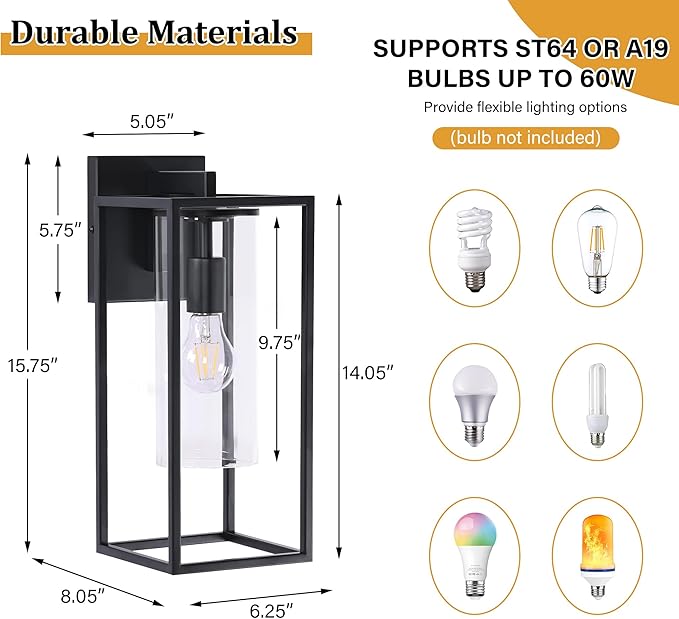 - 【E26 Socket & Recommended Bulbs】Bulbs Not Included. The waterproof porch lights for house can compatible with types of E26 bulbs. (LED bulb, Incandescent or CFL bulb) And this exterior lights for house with basic lighting features last longer than those lights with easily damaged. Save you the hassle of frequent light replacement