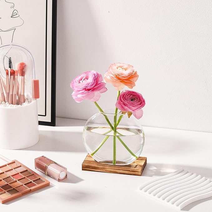 4 Pack Plant Propagation Station with Wooden Base Glass Terrariums for Indoor Plants Decorative Round Vases for Flowers Hydroponic Planter for Home Office Decor
