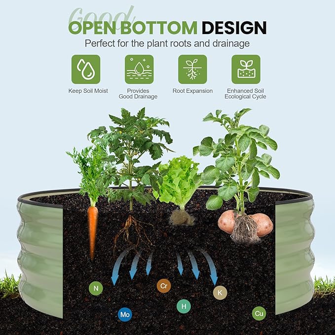 - 【Open Bottom Design】 The above ground garden bed feature an open base, promoting excellent drainage and aeration. This allows roots to grow freely, creating an ideal environment for healthy growth and abundant harvests.