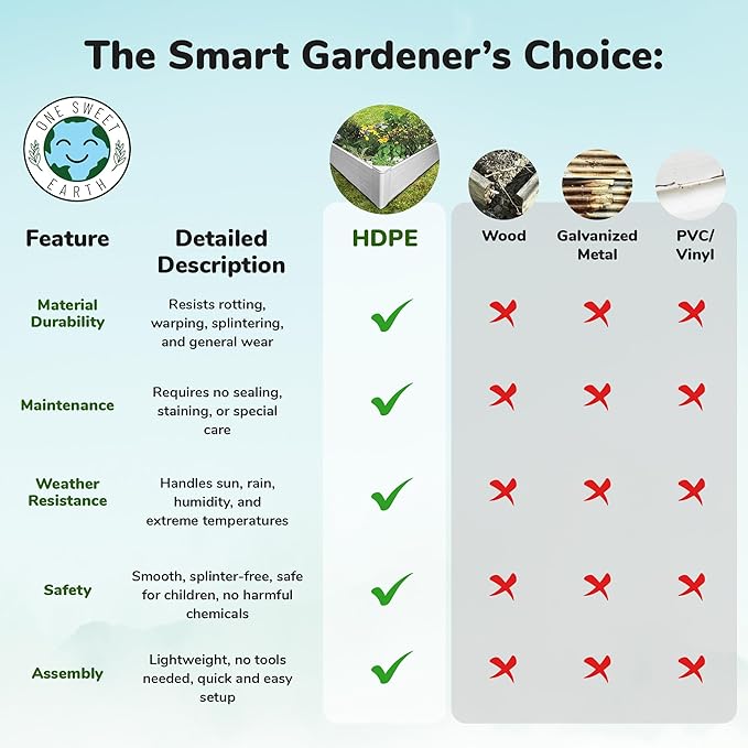 - DURABLE & WEATHER-RESISTANT DESIGN: Constructed from heavy-duty HDPE plastic, this raised garden bed resists warping, cracking, and rotting, offering season-long durability. No rusting, no splinters, and no painting—just dependable outdoor gardening season after season.