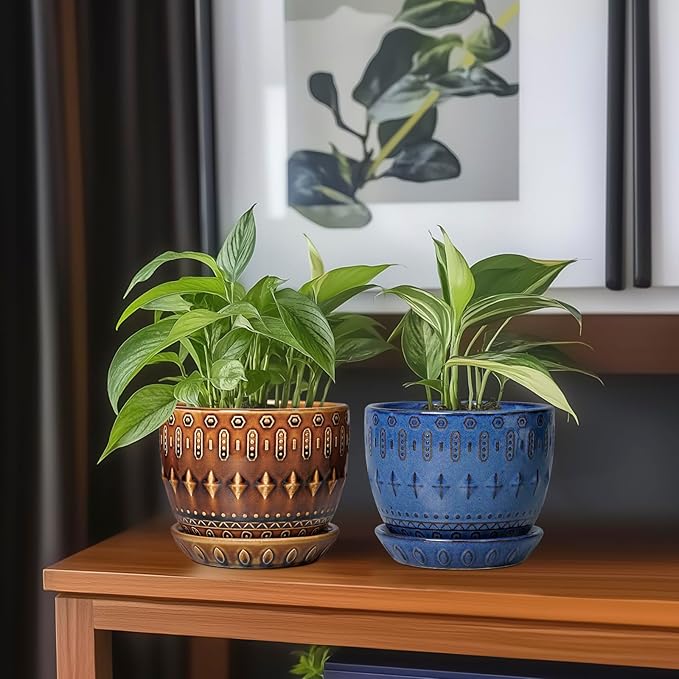 - Ideal Size of Indoor Plant Pot: Each ceramic planter is 5.5 D x 4.7 H, which can provide enough space for your plants to thrive. One package includes brown planter, ceramic tray and mesh
