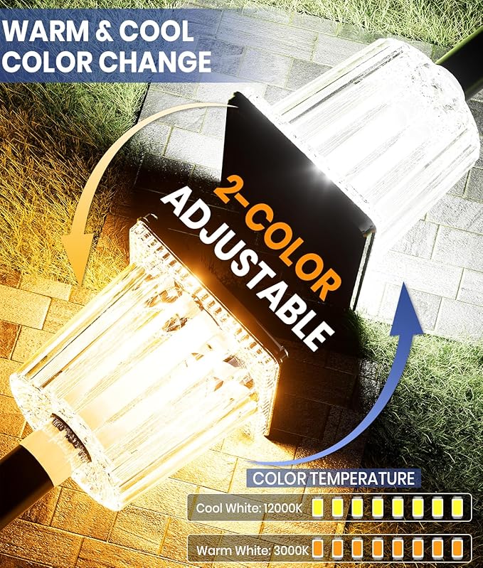 - 🌓 Dual-Tone Landscape Lighting System ▷§▁ Easily toggle the button on the back edge of the solar panel powered, change between adjustable warm white (fall/winter coziness❄️) and cool white (spring/summer vibes🌼). Adapt seasonally solar outdoor garden decor and create a holiday atmosphere moods outside lights for house.