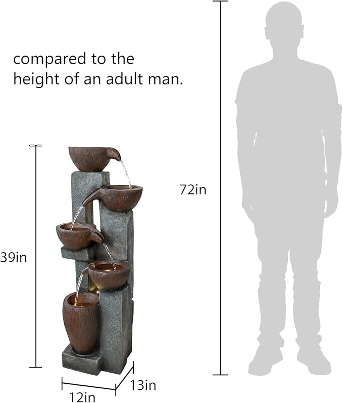 - With the suitable size 13" L x 12" W x 39" H for indoor or outdoor décor. The modern cascading bowls water fountain will add instant beauty to your surroundings.