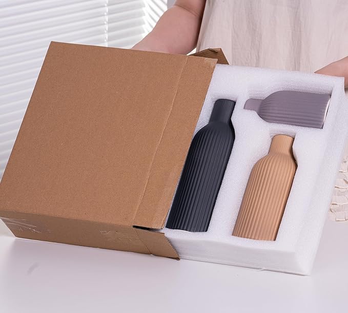 - Unique Ribbed Design : Featuring a distinctive ribbed texture and a warm brown finish,these vases bring a modern yet timeless aesthetic to your home.The vertical grooves create a visually striking pattern , making them ideal for farmhouse , pampas grass decor styles.(Length x Diameter=9.96 x 3.35", 7.87 x 3.31",5.79 x 3.31",the dimensions are all measured by hand , So there may be some small deviations.)