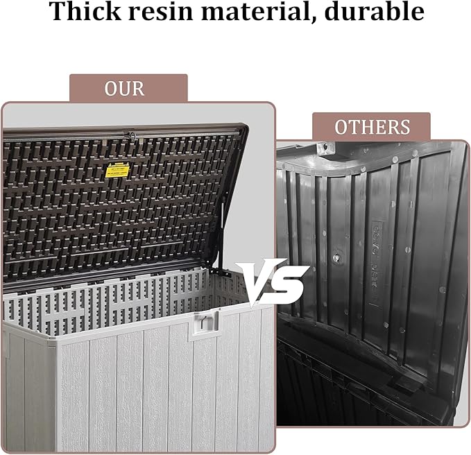 - All-Weather Durability Built to withstand any weather, our deck box is made from resin that offers waterproof, UV-resistant, and corrosion-resistant protection. No matter the season—be it scorching sun or heavy rain—this box will keep your items dry and its exterior looking as good as new.