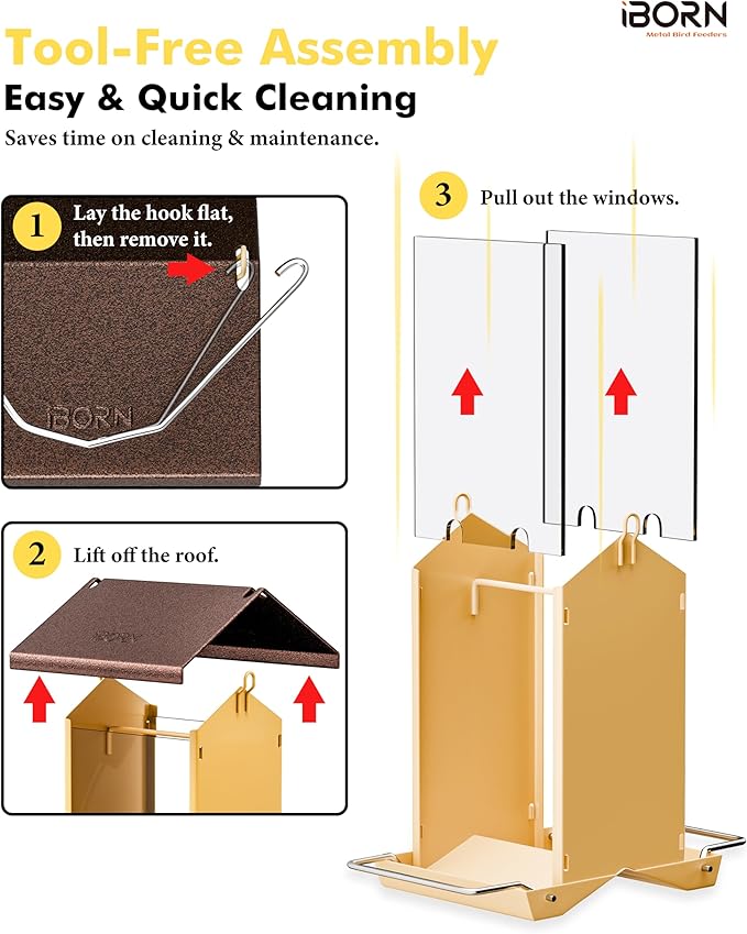 - 【Fully Detachable Design,Easy to Clean & Refill】iBorn squirrel proof bird feeders features a removable roof, foldable perches, and a wide opening for quick filling and effortless cleaning. The clear PC window lets you check seed levels at a glance. Every part is accessible — clean with just your hands, a brush, or towel. No hidden corners, no hassle. Perfect for bird lovers who want to enjoy nature without the mess.