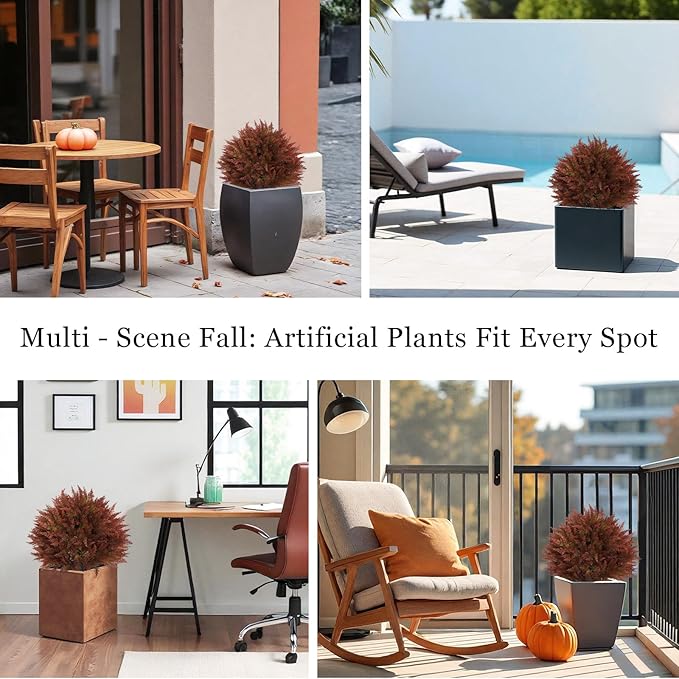- 【24" Fall Topiary Balls – Vibrant Autumn Ambience】These 24-inch fake plants feature lush, ball-shaped foliage accented with warm red tones, capturing the cozy charm of fall. Perfect for porches, garden paths, and outdoor planters, they bring instant seasonal curb appeal