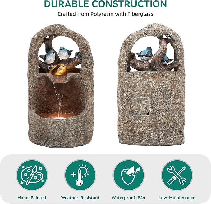 - Zen Natural Outdoor Fountain: This delightful garden floor wall fountain features a pair of playful birds perched on the tree trunks above a pool. With realistic handcrafted embossed textures and a hand-painted faux bronze finish, it adds natural organic and rustic charm to any garden, patio, or porch.