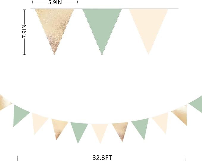 - Package Contains - 1 packs of sage green champagne gold fabric party bunting banner, Size of each flag is 7.9 x 5.9 inch,Total 32 feet with 36 pcs flags.