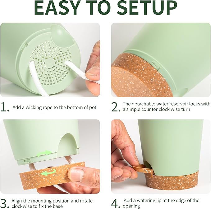 - Self-Watering Planter System: Our 4 inch small self watering plant pots feature a built-in wick rope that draws water from the reservoir, ensuring consistent hydration for your indoor and outdoor plants. Perfect for busy plant owners and those who forget to water!