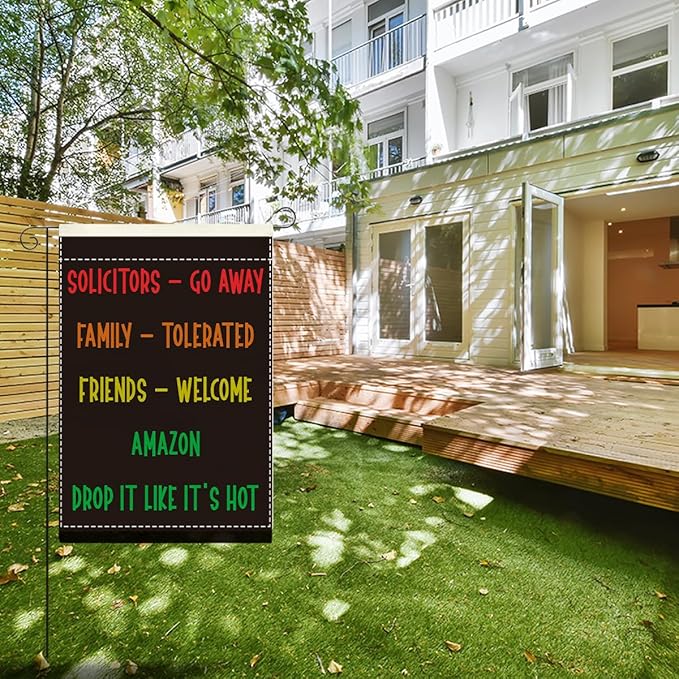 Funny Welcome Sarcastic Garden Flag Outdoor Decorations Go Away Family Tolerated Friends Small Double Sided Burlap art Stained Glass Style Garden Flags 12 x 18 Inch for Outside