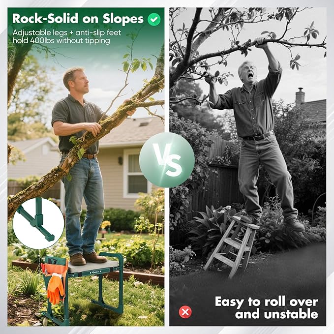 - â ăAdjustable Legs for Uneven Terraină Built with extendable support legs and non-slip rubber feet, this Sakerplus kneeling chair adapts to slopes, gravel, or soft soil. Designed to help maintain stability while planting in raised beds or trimming hedges, even on uneven ground.