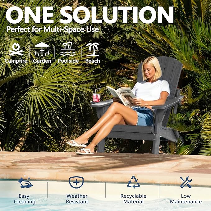 - Durable HDPE Material–Built to Withstand the Elements: Made from high-density polyethylene (HDPE), this Adirondack chair offers superior resistance to weather, fading, and cracking. Unlike wood, it won't rot, peel, or splinter, making it ideal for year-round outdoor use with virtually no maintenance required.