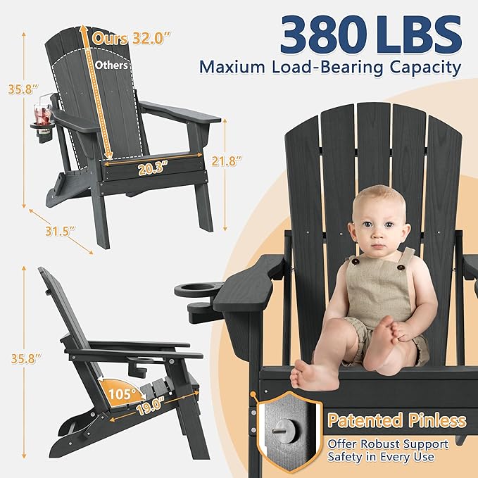- Durable HDPE Material–Built to Withstand the Elements: Made from high-density polyethylene (HDPE), this Adirondack chair offers superior resistance to weather, fading, and cracking. Unlike wood, it won't rot, peel, or splinter, making it ideal for year-round outdoor use with virtually no maintenance required.