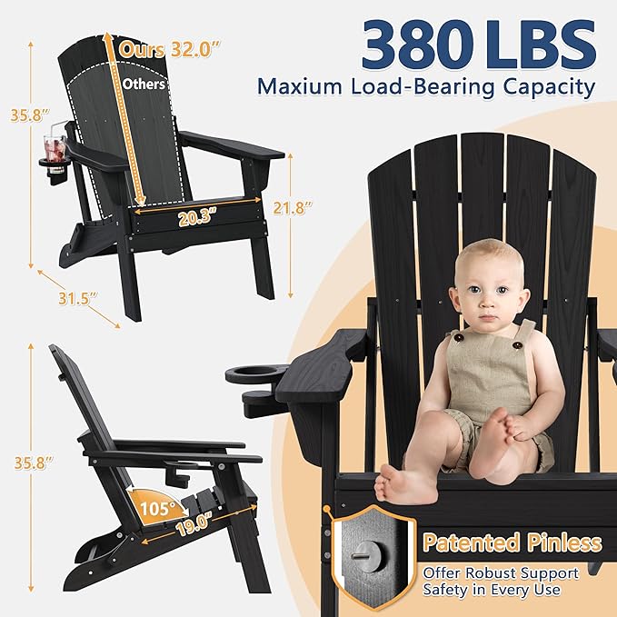 - Durable HDPE Material–Built to Withstand the Elements: Made from high-density polyethylene (HDPE), this Adirondack chair offers superior resistance to weather, fading, and cracking. Unlike wood, it won't rot, peel, or splinter, making it ideal for year-round outdoor use with virtually no maintenance required.