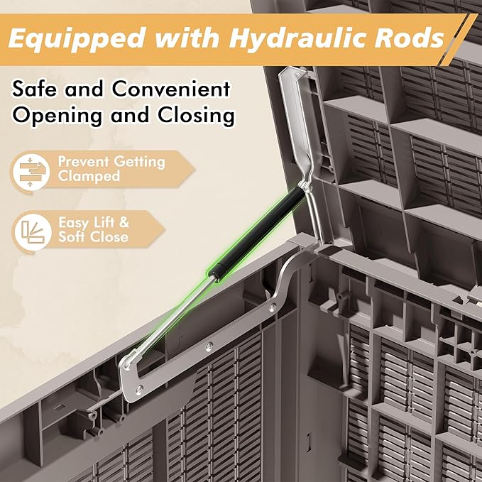 - π Hydraulic Lid with Lockable Design for Safe Access Equipped with hydraulic gas lift rods, the lid opens smoothly and closes gently to prevent pinched fingers. The lockable lid adds an extra layer of security, making it an ideal choice for shared outdoor spaces or secure backyard storage. (Lock not included)