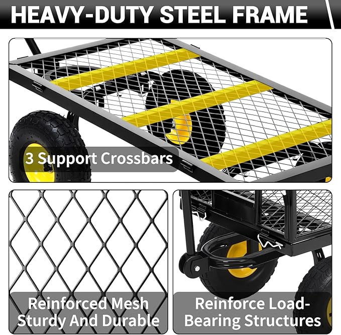 - STRONG ALL-STEEL CONSTRUCTION: This gardening wheelbarrow is made of high-quality steel for excellent durability and corrosion resistance. The entire cart includes an all-steel mesh bed designed to withstand heavy loads and harsh weather conditions. Invest in this gardening wheelbarrow that will not only meet your expectations, but exceed them, providing you with a reliable experience that will stay with you for years to come.